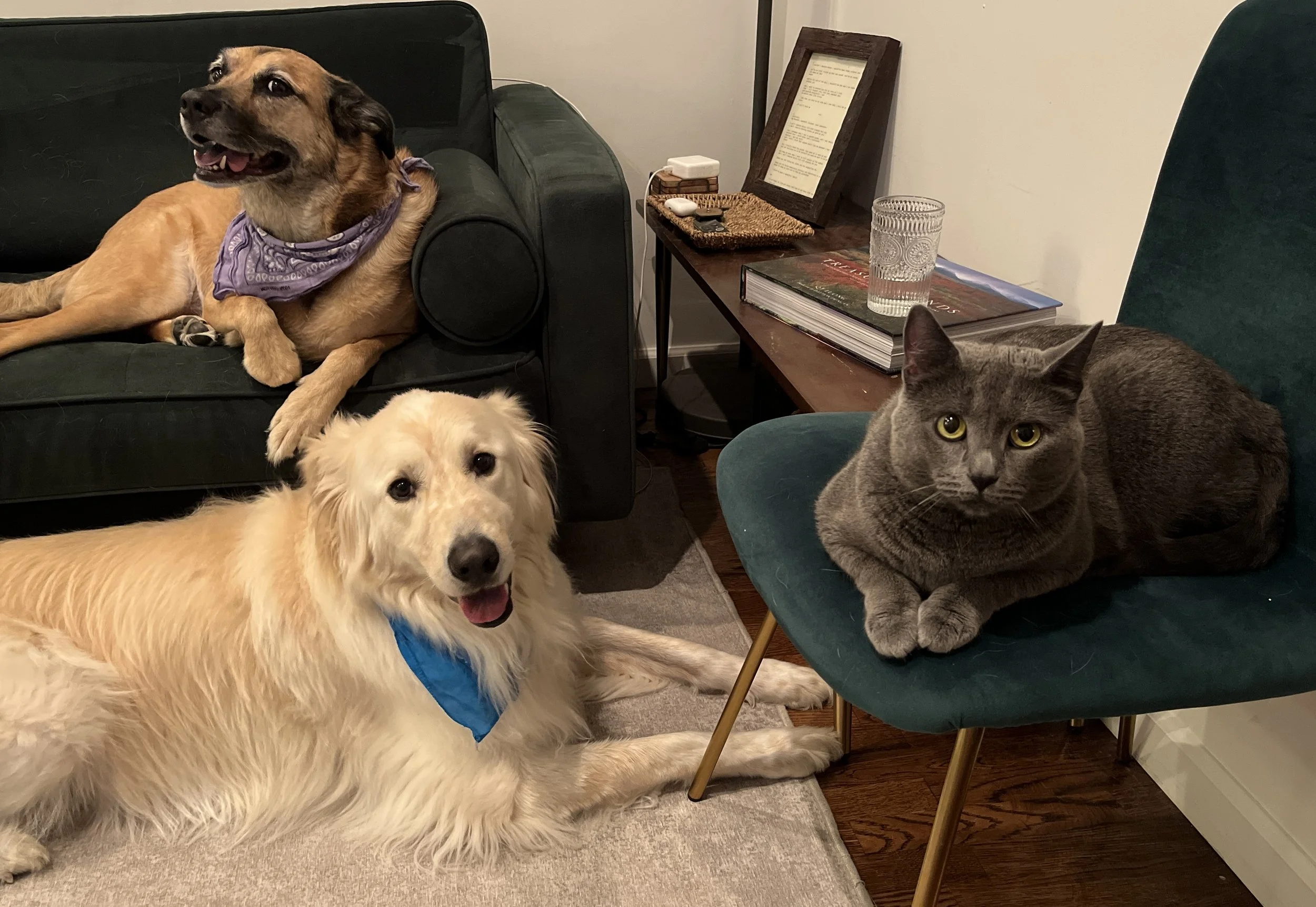 Athena (shepherd mix), Apollo (Pyrenees/Golden), Ziggy (alleycat)